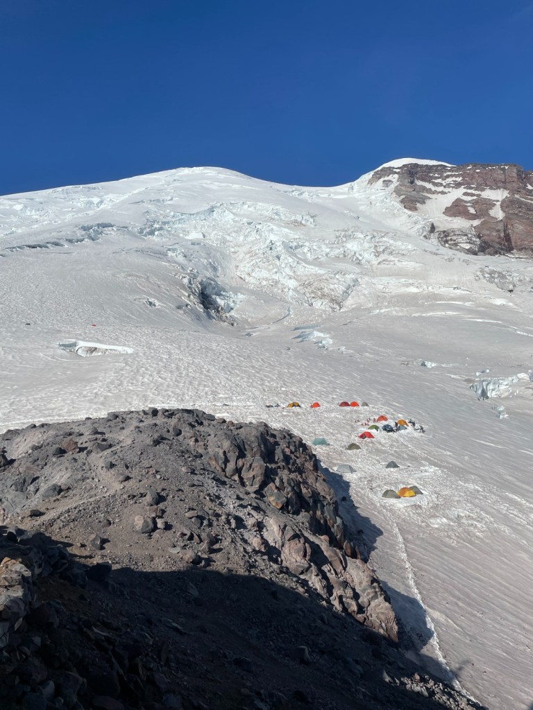 We finally arrived back at camp around 1pm, after a 13 hour effort. It was quite a relief to finally be able to rest, and I could not wait to take off my boots. Bryan welcomed us back with some strong electrolytes in water, and I dunked my feet in the cold snow. I thought I was experiencing a blister in my big toe with about 2000 feet of drop to go, but it turned out to thankfully be just a hot spot. I resolved to tape my toe for the hike down to the trailhead. It should be noted that Mehmet and I were the first climbers on a Bryan-run trip to have made the summit of Mount Rainier. Bryan’s two previous trips were foiled by altitude sickness, including Bryan short roping his buddy (who was suffering from pulmonary edema) down the Emmons back to Camp Schurman. Despite not Bryan making the summit he was very happy with the result!