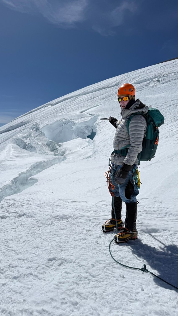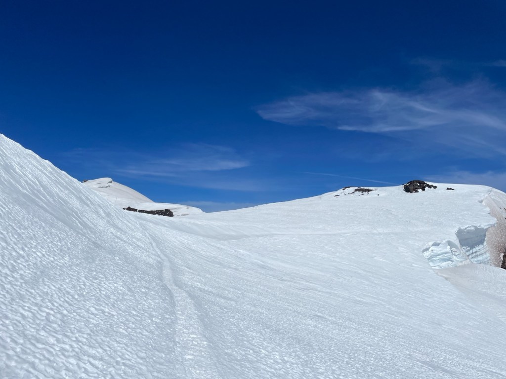 We eventually caught up to the large group (The Glacier Gals) at about 4000 meters and our pace slowed as it was unsafe to pass them. It was here we encountered quite a bit of powder snow and also a couple sections with very high exposure (sheer drop on the right side) but not too much of a challenge. Eventually the trail widened out a bit and I noticed we were way off the route that was displayed in my OnX Backcountry app. As we passed the Glacier Gals, I asked the two rope leaders what was going on and they said the route gradually changes over the climbing season, so perhaps the route in OnX was an earlier season line? I also asked how far we were and they said 700 feet to go. I jokingly asked if that was horizontal and we all laughed as they had clearly meant 700 feet of vertical.