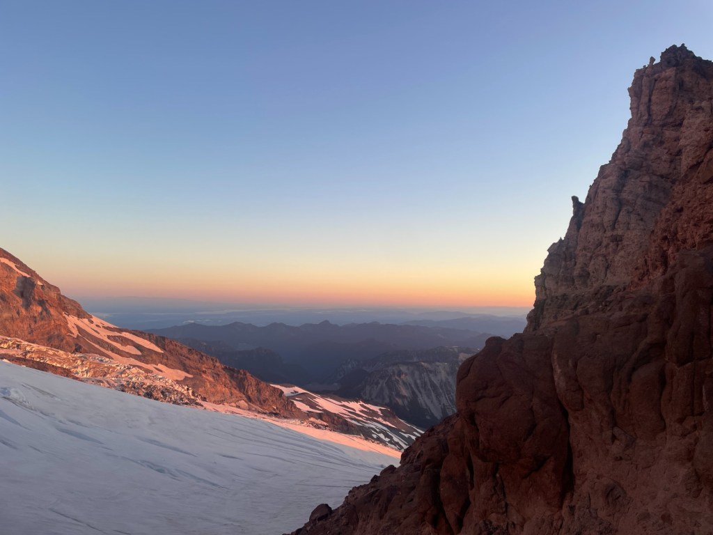 The glissade down the Inter Glacier, which would amount to about a third of our vertical for the day at just over 500 meters, was super fun, and far less stressful and dangerous than my previous misadventures on Mount Whitney. The snow was just soft enough to not be too fast, but not too soft that it was easy to keep control. I still played it pretty conservatively and used my axe to check my speed the whole way down. Super fun and I joked at the bottom: “Let’s do that again!!”