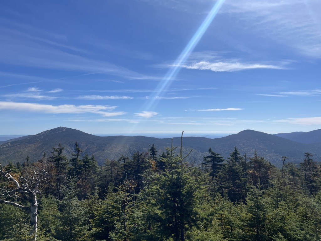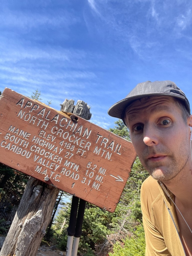 The trail was pretty rugged with lots of roots and rocks to contend with, but I felt strong moving up towards South Crocker, whose summit was just off the junction in the trail. It was a bit of a drop into the saddle to head over to Crocker, and I arrived at around 10am. While approaching and at the summit (4229 feet), I ended up making a couple of calls about apartments and also made an appointment at the bank in Bangor to set up a US bank account. On the way back up to South Crocker, I ran into a few hikers, including one lady who was an AT trail hiker. The South Crocker summit (4042 feet) wasn’t particularly exciting, but there was a nice viewpoint just off the trail which offered a great view of Sugarloaf Mountain and its namesake ski resort. I spotted a pretty gnarly ravine on the back side and wondered if it’s skied regularly.