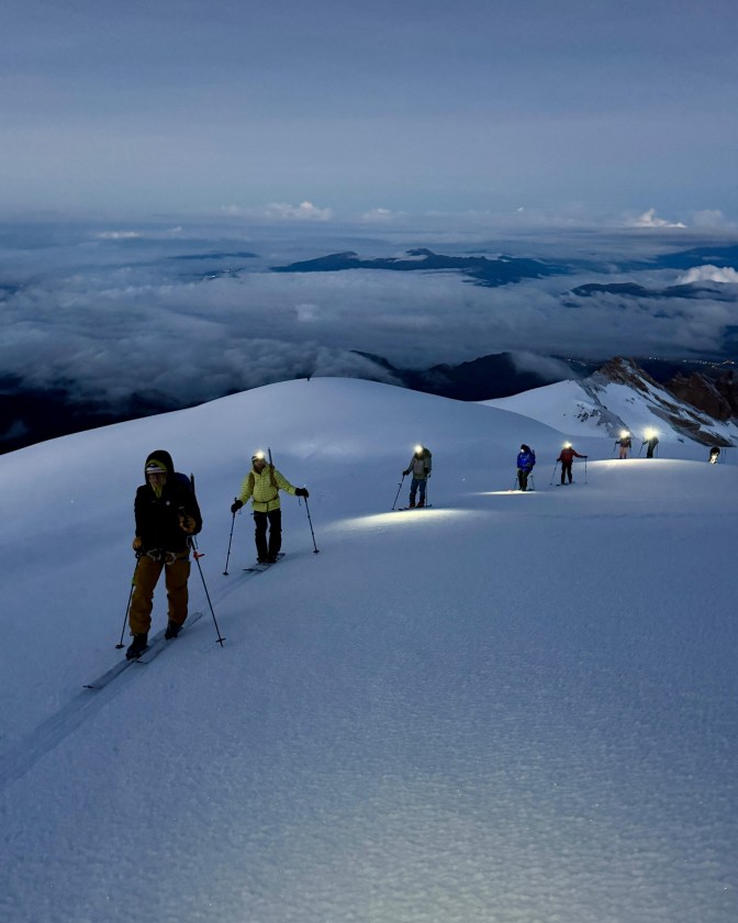 Breakfast was buns and jam as well as hot drinks – despite how tired I was, I opted for tea as I’m not a fan of coffee at altitude. It was drizzling outside when we got up, which delayed our departure slightly and gave me the time to do a “No 2” – I was very concerned about emergencies up high and needing to use a wag bag. Ryan and Jennifer ended up taking anti-diarrhea medication which wasn’t a bad idea. We started our hike, in our ski/snowboard boots, just after midnight. I brought my hiking boots in my pack – I wasn’t too keen on hiking down in ski boots, so I planned to cache my boots just below the glacier and change after we couldn’t ski any further. The hike was a bit weird and awkward (running on minimal sleep didn’t help things) in boots but not too bad overall.