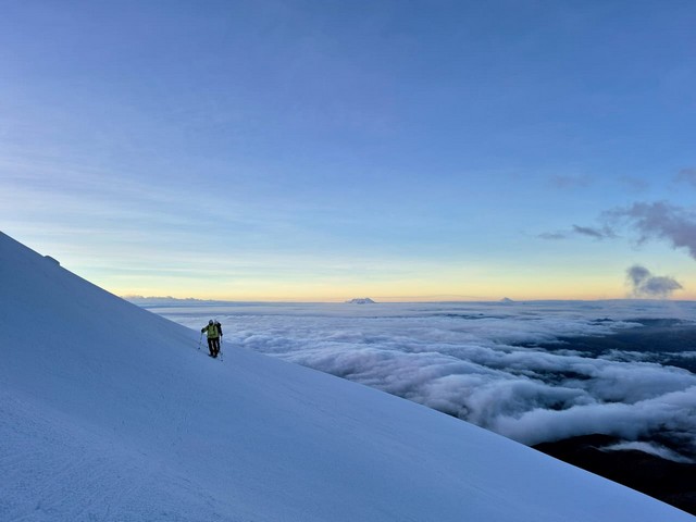 We made two stops before transitioning on flatter areas of the glacier. Annoyingly, I was unable to pee on these stops, despite being quite regular the entire trip. Probably partially related to undiagnosed paruresis (shy bladder syndrome – sorry for the TMI. Something I really need to work on addressing for expeditions…). In addition I didn’t fuel/hydrate as much as I’d have liked on these stops, which probably came into play later. As we got higher, the glacier got steeper (requiring slightly stressful switchbacks – I was NOT confident doing kick turns!), and the group began to spread out as some of us started to experience the effects of the altitude. At this point, sunrise arrived and we were greeted with an incredible view of the upper slopes of Cayambe above, as well as the shadow of the mountain and of Antisana (the 4th highest peak in Ecuador) and Cotopaxi (2nd highest) in the distance.