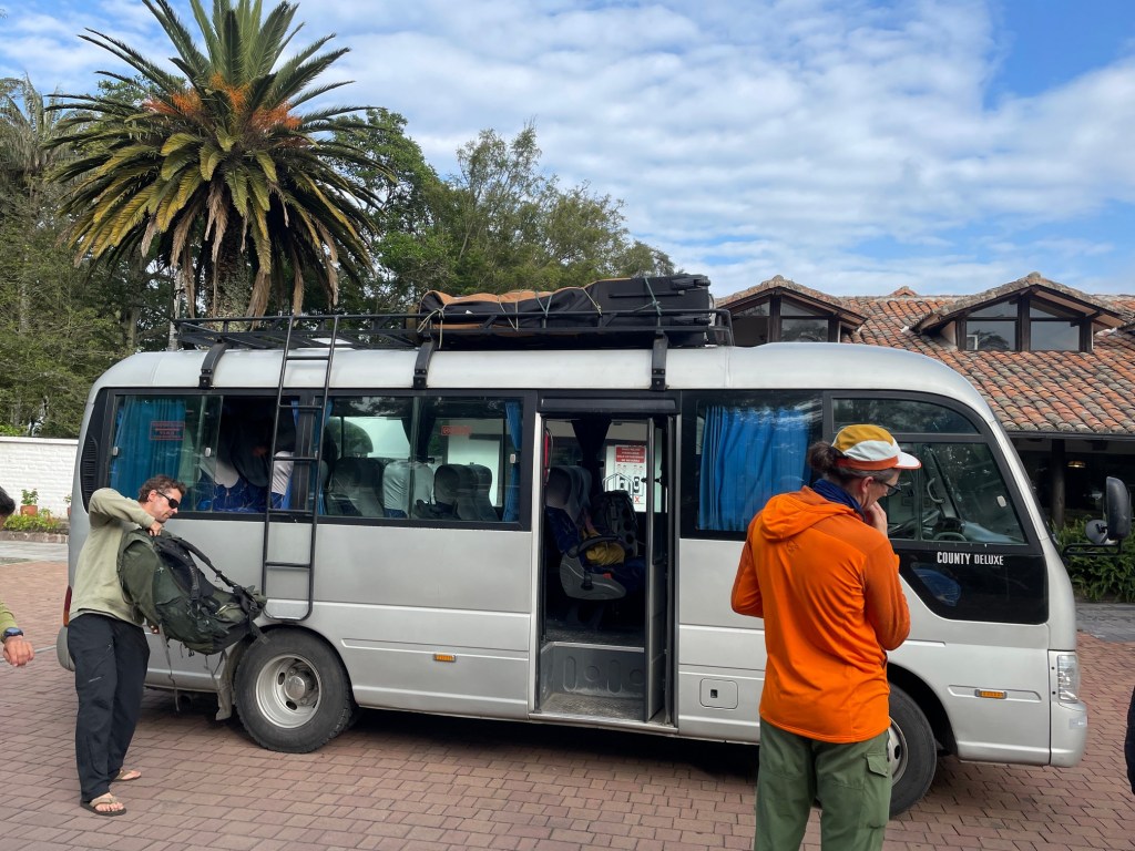 The following day was our last at San Jose de Puembo (at least until we returned at the end of the trip). Leaving was a bit chaotic as I tried to do some stretching after breakfast and before departure, and ended up getting locked out of my room when I went back to pick up my last bag. Victor and the guides somehow loaded the bus with all our gear (including a bunch on the roof). Gaspar mentioned that there was some issue with the Cayambe park staff concerning skiing on the volcano, so we handed off our skis to our support team at a convenience store about halfway to the park, and then we were off.