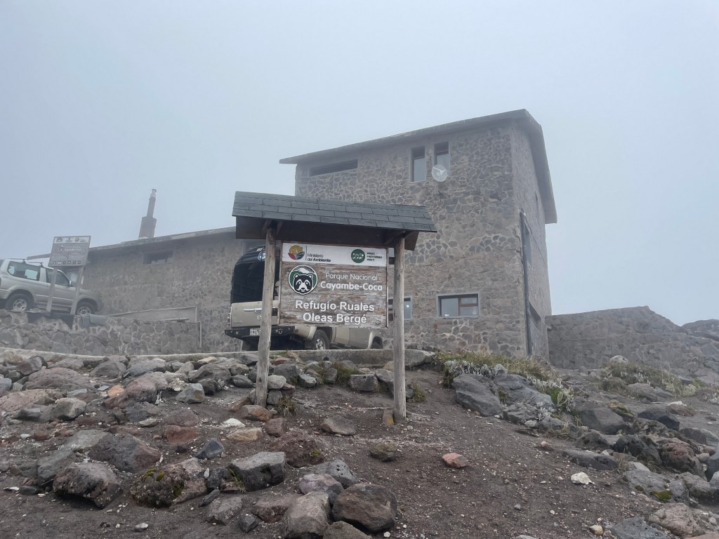 We drove past the town of Cayambe and up the road towards the Refugio Ruales Oleas Bergé, crossing north over the equator. Victor brought us about as high as possible that the bus could go (the road is extremely rough higher up and requires 4WD), at around 4300m, and we began hiking up the road. The plan was to stop by the refugio (4625 meters) then on to the edge of the glacier depending on how everyone felt. It was a pretty foggy day but overall the hike went pretty well. We briefly stopped in the refugio (which was far nicer than the one on Pico de Orizaba) for a breather and some tea, before heading back out.