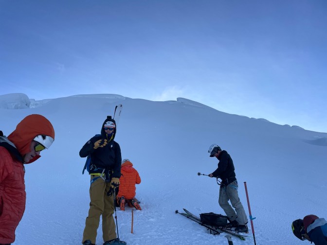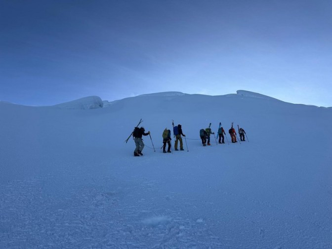 The initial climb up the glacier was long, but we quickly settled into a good rhythm in both pace and breathing – I personally really enjoy skinning so I was definitely (for the time being) in my happy place. Despite being close to 5000 meters above sea level, I felt pretty good. The ski crampons were also pretty amazing pieces of kit – got great purchase on the slope and overall much more confident with grip/traction than skins alone. They would have been pretty helpful on Mount Marcy! I ended up ordering my ski crampons from Evo and got the ones that were compatible with my bindings – Marker Pintechs.