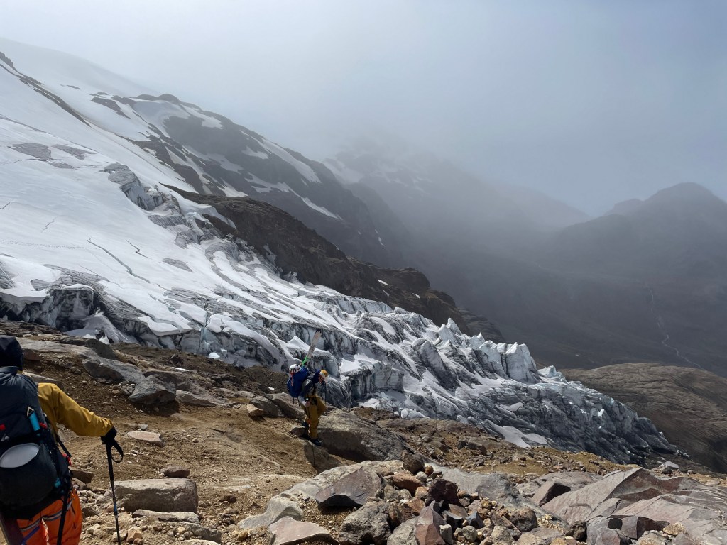 The descent was definitely by far the most high stakes ski descent of my life. Tired, affected by altitude, on wild glaciated terrain – it was super great to have both Gaspar and Michael leading us (Fátima and Pablo, not skiing had taken off right after our team photos). The first couple of pitches were tricky due to steeper, icier terrain as well as some crevasse hazards, but I was able to get down with no issues. There was a ton of side sweeping on my side and it was definitely humbling – my downhill definitely needs a TON of work! Once we got down to approximately where we transitioned, the skiing became much more mellow and FUN – it was super memorable and we were all whooping and hollering the whole way down. There were still a few crevasses to watch out for but overall not too scary. In no time (and far too soon!) we got to the bottom of the glacier, where we took off our skis (and I switched to hiking boots) and began the hike back down to the Refugio.