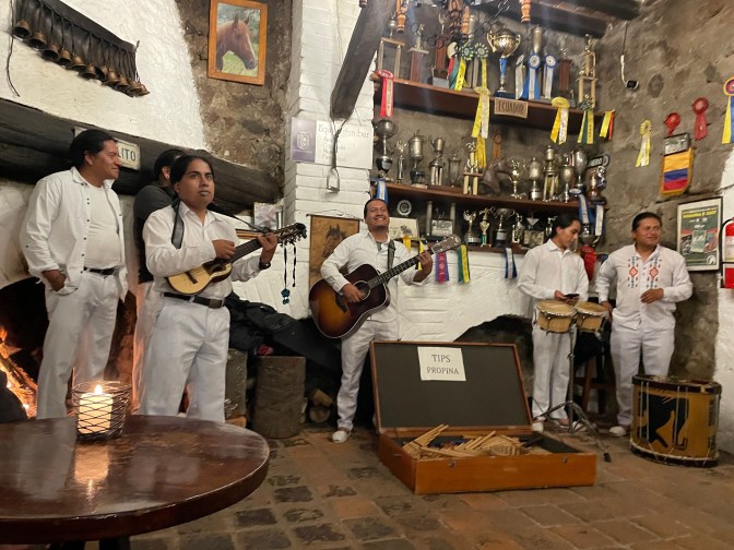 Victor drove us to our next hotel, Hacienda Pinsaqui, just north of Otavalo, where we checked in and had a late lunch. After lunch, I repacked and organized my stuff (including drying gear such as skins), and before long it was time for dinner. Prior to eating, we were invited by the hotel owner to enjoy some traditional Andean music by a band of brothers and cousins and learn about the history of the property – it dates back to 1790 and began as a wool-weaving workshop. It was also frequented by Simón Bolívar, who led several Andean countries in separating from the Spanish Empire in the 1800s and prepared at the Hacienda Pinsaqui prior to the Battle of Ibarra during the Ecuadorian war of independence in 1823.