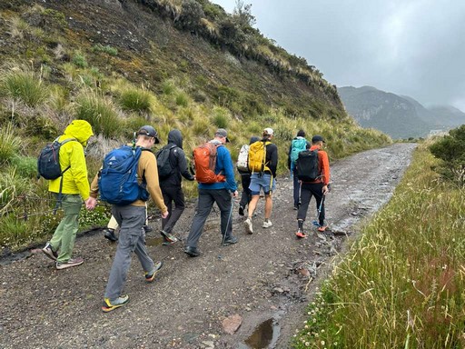 The next two days we began acclimatization hikes to get us used to the higher elevations and prepare for our summit attempt of Cayambe later in the week. Our first was a short drive east to the outskirts of Cayambe Coca Park. Our driver, Victor, drove our bus partway along a gravel road, letting us off at around 3850 meters elevation, and we began hiking in a light drizzle, making sure to focus on keeping heart rate low. After a brief stop at a small hut to layer up and grab a snack, we proceeded onwards and reached the Papallacta Antennas, a series of telecommunications antennas atop a small hill. We topped out at around 4400 meters, took a quick break, and descended part of the way, where Victor was waiting for us. For lunch we stopped at a mall in Quito and went to Crepes & Waffles (very good), then returned to the hotel to rest and put in another stretch session at the gym.